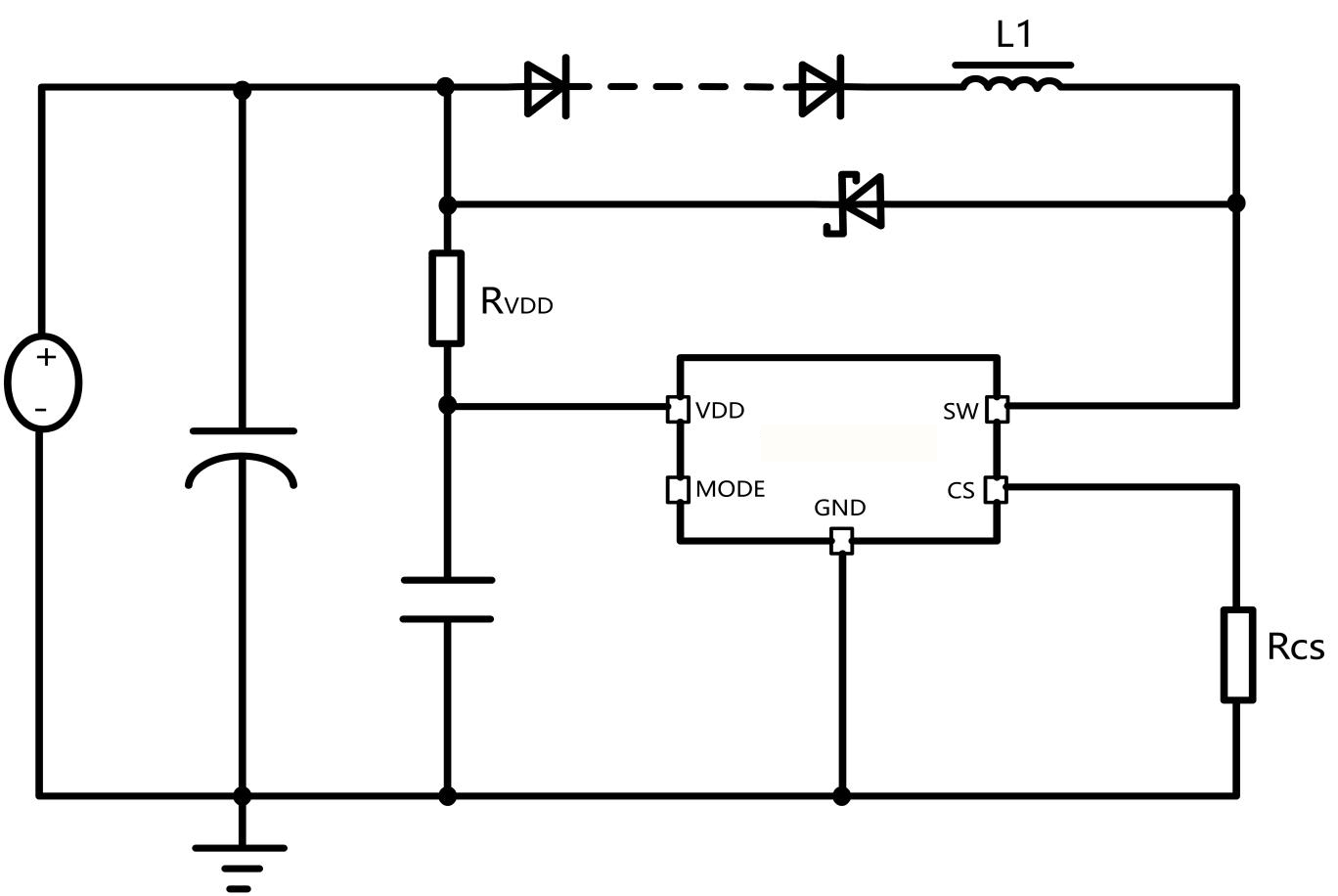 其中VDD取決5.8V,IVDD典型取值2mA,VIN為輸入電壓。芯片內部接VDD腳的穩壓管最大鉗位電流不超過10mA,應注意RVDD的取值不超過這個,以免流入VDD的電流超過允許值,否則需外接穩壓管鉗位。